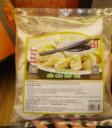 Trọng lượng : 19 g/cái Quy cách đóng gói : 20 chiếc/ 1 bịch Thành phần: Bột mì (25%), Kim chi (17%) Thịt heo nạc, Thịt Gà, Mỡ lưng heo Nước Hành lá Dầu thực vật (dầu mè, dầu nành) Chất ổn định (1440,451) Muối i-ốt Tiêu Chất điều vị