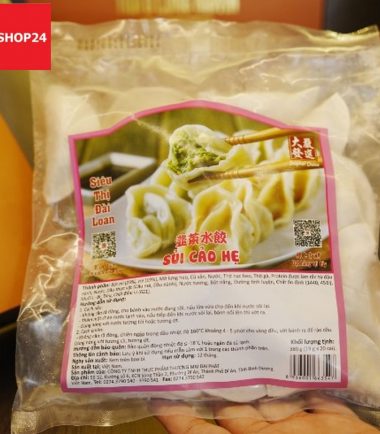 Trọng lượng : 19 g/cái Quy cách đóng gói : 20 chiếc/ 1 bịch Thành phần: Bột mì (25%) Thịt heo nạc, Thịt Gà, Mỡ lưng heo Nước Hành lá Dầu thực vật (dầu mè, dầu nành) Chất ổn định (1440,451) Muối i-ốt Tiêu Chất điều vị (621) Hương dẫn